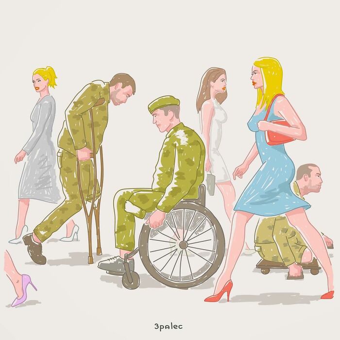 Load More Replies...Another viewpoint, the soldiers are men, women are passing by ignoring them. 1. Are all the pretty girls ignoring them because they are not interested in broken men? 2. Is this representative of a country that does not let women go into combat? 3. Is this a 'time' when women were in the military, but not able to be deployed. I'm ex military, 1980, 81 82 and 83. Male dominated role, was really pissed to find out I couldn't be deployed! I had a lifelong injury despite this. So many different viewpoints....