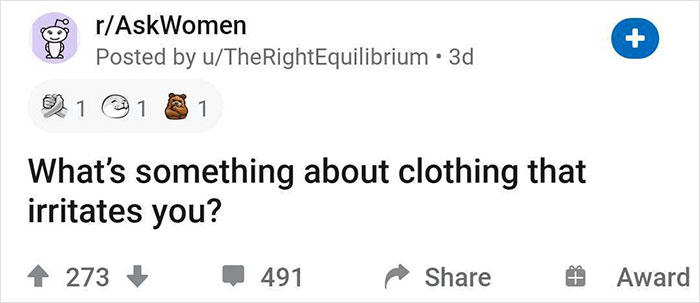 When asked which responses he found the most eye-opening, u/TheRightEquilibrium said: “There was a comment about how clothing for women isn’t to be comfortable but it’s made so the women can be looked at, which I agree with, which is super strange and kinda rude. Also, what’s up with the no pockets thing? Just add pockets! There are a few other things, but then I’ll just be ranting,” he added.