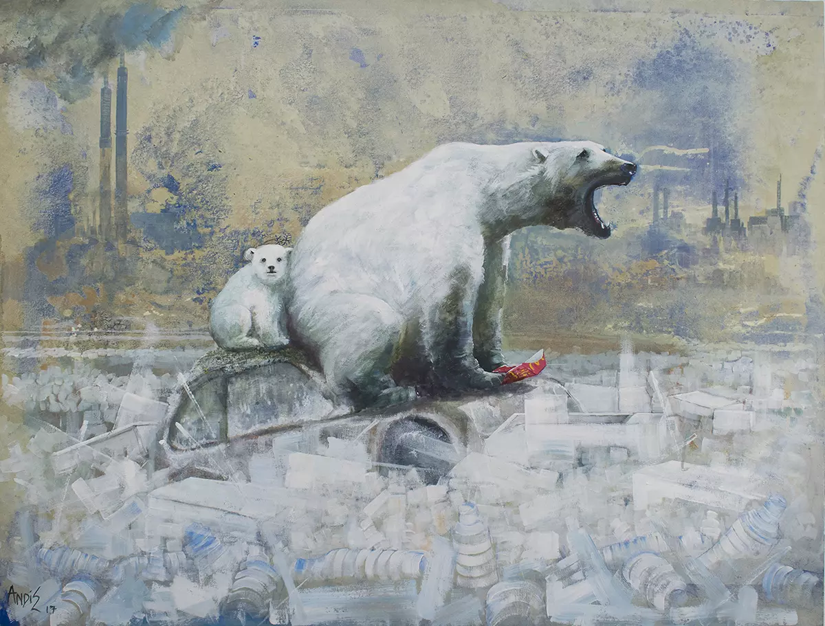 This new exhibition continues the theme he started earlier in the year with his 20/50 Vision: Tomorrow’s Habitat exhibition. Here Andrew’s work commented on the possibilities of our way forward with technological advances in different ways of growing food (Beef Tanks), people (Test Tube Babies) and body parts (Spare Parts) but with also severe warnings of what could be the consequences of our actions if we do not look after the planet (The Scream, Penguins and Polar Bears).