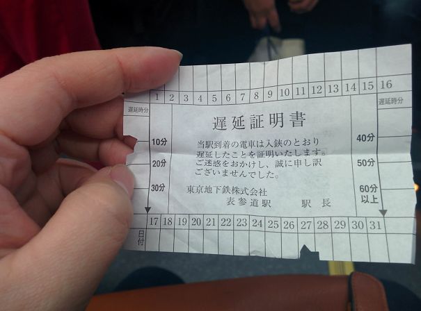 Sheet Of Paper That Japanese Trains Give To Riders To Excuse Their Tardiness At Work. It Indicates The Date And How Late The Train Was