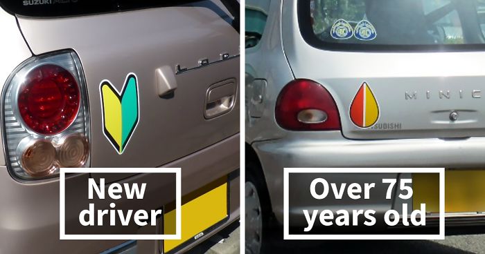 In Japan, Beginner Drivers Use A Shoshinsha Mark - Green And Yellow V-Shaped Symbol That New Drivers In Japan Must Display On Their Cars For One Year After They Obtain A Standard Driver's License. There Is Also A Fukushi Mark Used To Denote Elderly Drivers