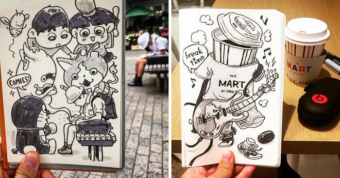 In her little notebook, the Japanese artist Hama House makes beautiful sketches with the routine situations of strangers such as a conversation, a lunch and even a snooze on a train.