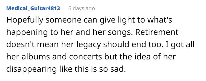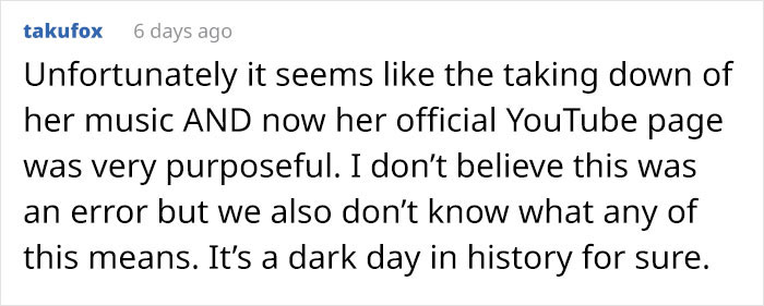 The same Redditor later updated his initial post by adding: “Seeing that her media has been removed not only from streaming services, but also from iTunes and in Amazon in the form of physical CDs, this is definitely not a mistake.