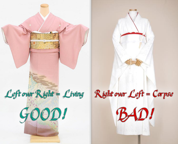 I am a japanese and I can only say about these pictures is 左前(hidari-mae) is not good