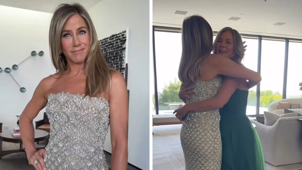 The video began with a close-up of her strapless Oscar de la Renta gown, seemingly built from seashells, before panning to her spacious living room. Aniston was seen hugging longtime friend and The Morning Show producer Kristin Hahn.