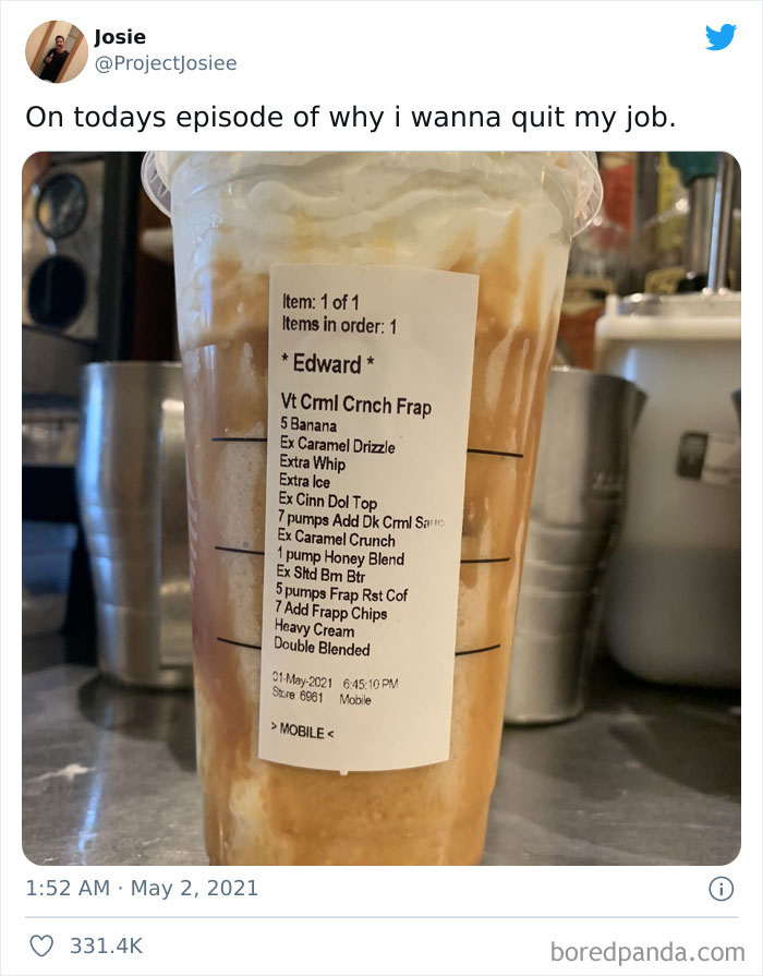 You can bet your bottom dollar that Josie's thread touched a nerve on Twitter. His photo got more than 331.4k likes and was retweeted a combined total of 51k times at the time of writing. That just goes to show that customers like Edward and their logic-defying orders aren't anything rare—they're out there and they're coming for you (if you're a barista).