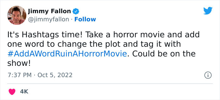 And that’s just the tip of the iceberg of all the witty creations that Twitter users shared with Jimmy Fallon, the host of the hilarious The Tonight Show after he pitched them a new challenge. Fallon, announcing another “Hashtags time!”, asked his fans to take a horror movie and add one word to change the entire plot. Check out the best tweets below and upvote your faves ones as you’re scrolling down, Pandas. Meanwhile, we’d love to hear your own ideas, so drift on by the comment section to flex your creative muscles!