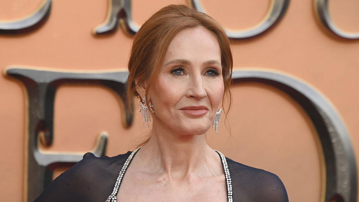 J.K. Rowling at event, wearing black dress and earrings, amid controversy over Harry Potter cash funding anti-trans project.