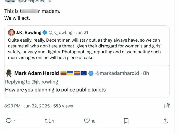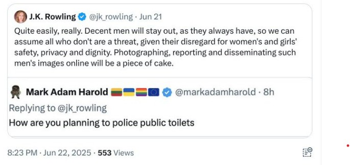 2/2 Gender critical feminists like Rowling mostly do not care who uses which public toilets (provided women remain safe) and they know it's a crime to police such use on the basis of gender identity here in the UK. A trans woman using ladies loos in public poses no threat to anyone; a trans woman using gents loos in public is liable to suffer harassment or other forms of abuse. Therefore gender critical feminists such as Rowling mostly would rather trans women used the ladies loos because that's the safest option all round, does nothing to undermine the safety and dignity of cis women, and in any case here in the UK it's a crime to police the use of public loos on the basis of gender identity. The people who pose a risk are the ones spreading lies and hatred - oh, and the abusers who are going to abuse people regardless.