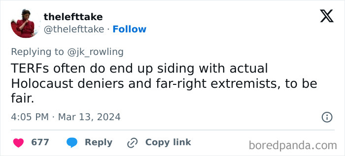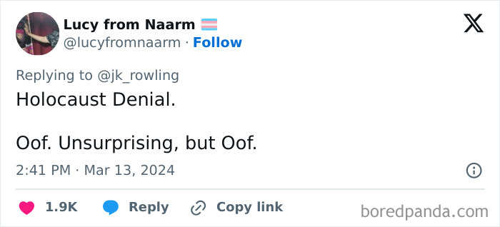 Load More Replies...That's not Holocaust denial?! I mean I'm not a huge fan of JK anymore, but people hate on her just for their personal fun. We get it, she is a TERF, call her out on that. Don't fabricate accusations out of your own voluntary misunderstanding of her words.
