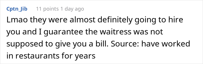 The Redditor was looking to get a job to help his dad with the bills when he noticed a restaurant nearby was hiring. So Late-Impression1372 rolled up his sleeves and went to an interview he likely won’t forget soon.