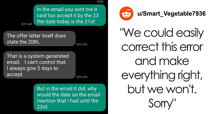 “It looks like a double mistake on the part of both HR and the applicant, who were inattentive to the offer letter and didn’t clarify the difference between 5 regular and 5 working days,” says Alexei Shkurat, the founder and CEO of Peach art studio from Ukraine, whom Bored Panda asked for a comment here. “However, further, in my opinion, no one stopped the employer’s representatives from understanding the situation, and their refusal also looks ugly.”