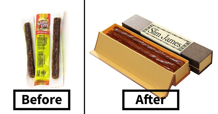You could also say that by having a more unique/special packaging people will take more time to actually properly taste and enjoy these snacks and thus increasing their value. What I would also find interesting is a post where we would repackage expensive food/drinks as junk food like caviar or old whiskey's in a basic can.