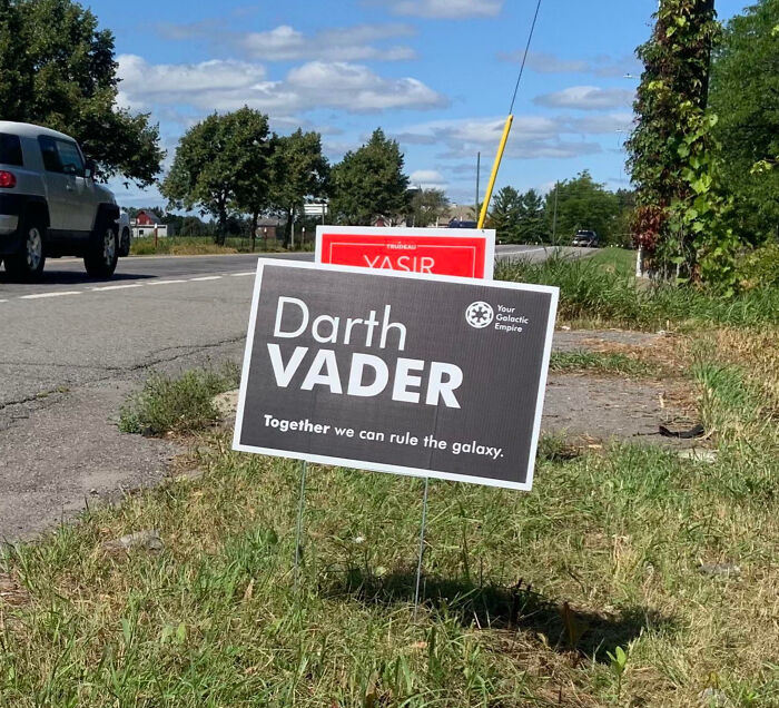 Yard signs on a roadside for fictional candidates, humorously capturing just Canada things.