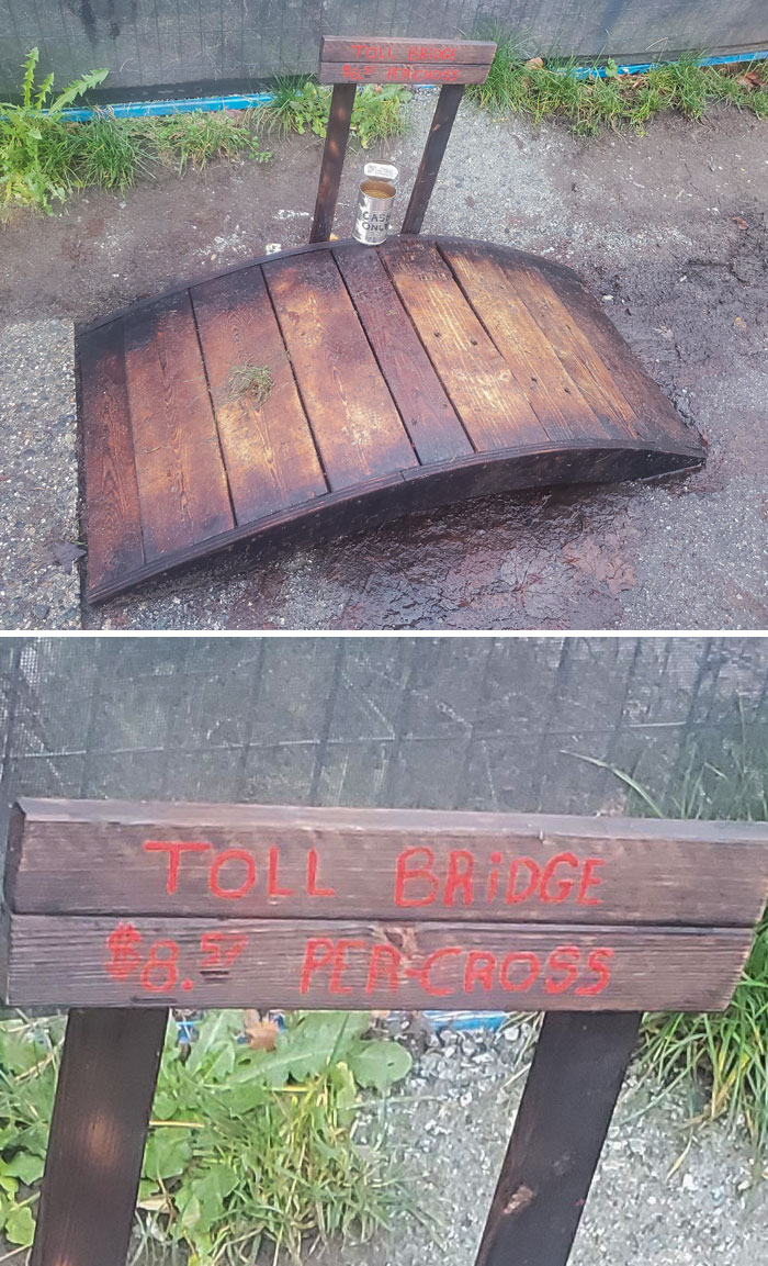 Rustic wooden toll bridge with $8.75 sign; quirky example of Just-Canada-Things humor.