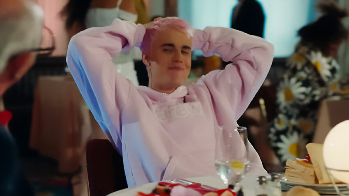 The music video ends with Bieber looking into the camera while sitting alone at a table, as an older man continues to eat at a different table.