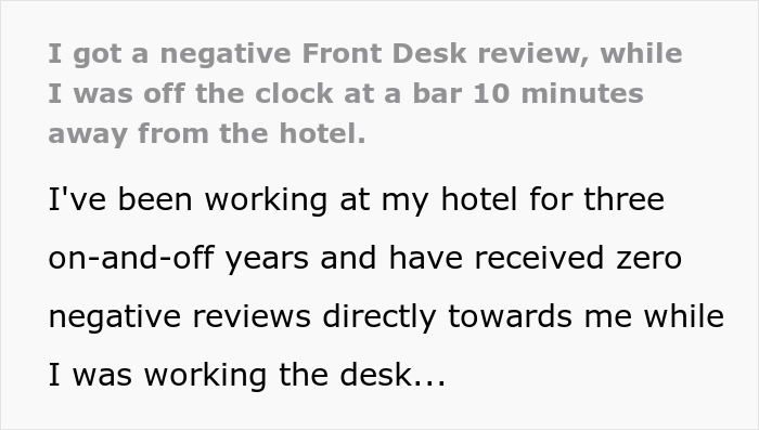 It turned out that the client simply remembered the face of the front desk agent, and she, in her own words, was firmly convinced that people in this position should not drink at all – either during work or in their free time. However, the OP’s manager did not think so, and the review was removed by corporate, the entitled guest was put on the DNR list, and the boss herself invited the author of the post to the same bar that evening, and even bought the first round.