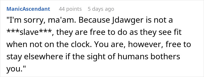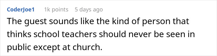 People in the comments mostly sided with the original poster as well, stating that demands towards hotel staff not to have any recreation at all look really arrogant. “The guest sounds like the kind of person that thinks school teachers should never be seen in public except at church,” one of the folks in the comments aptly noted. Be that as it may, commenters are pretty happy things worked out this way.