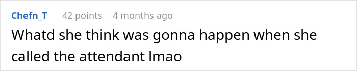 Long story short, the “Karen” in question caused a scene. She demanded to see the woman’s ticket, told her to get lost, and eventually involved an attendant who obviously backed the author and instead ordered the passenger to move her bag. But that’s not the end!