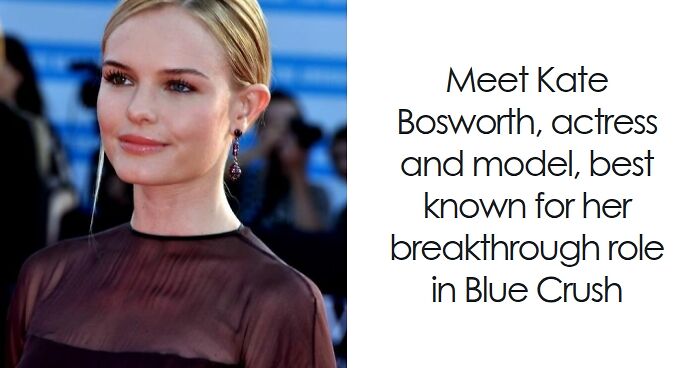 Kate Bosworth first garnered significant attention with her lead role in the 2002 surfing drama Blue Crush, a box office success that grossed $40 million. She then notably portrayed Lois Lane in the 2006 blockbuster Superman Returns, which earned $391 million worldwide.