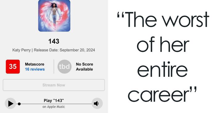Katy Perry’s latest album, 143, is the worst-reviewed of her career on the review aggregation site Metacritic