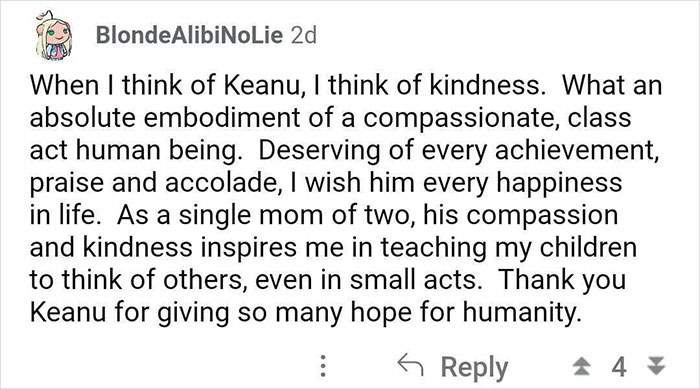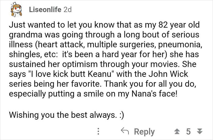 Keanu wrote this wholesome reply to Sno0pyBo0’s post on his AMA thread. “I was very surprised and needless to say, very happy to receive such a kind and thoughtful reply from Keanu. It was a small and simple interaction but it really made my day, week, month, and year!”