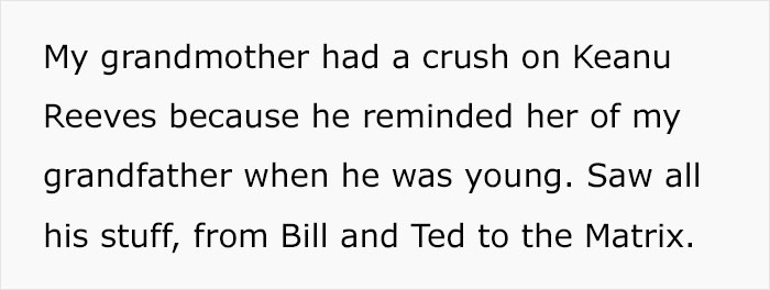 A Reddit user called afdc92 commented, recalling his grandmother’s crush on Keanu Reeves because of his resemblance to his grandfather when he was young. Grandma saw every movie that had Keanu in it, “from Bill and Ted to the Matrix.”