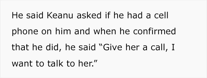 Keanu asked if the man had a cell phone and the uncle confirmed he did. Keanu said “give her a call, I want to talk to her.” He spoke with the grandmother for several minutes and “it absolutely made her year.” The commenter finished the story saying “she was so isolated and his genuine kindness to her and interest in her showed what a truly amazing man he is.”