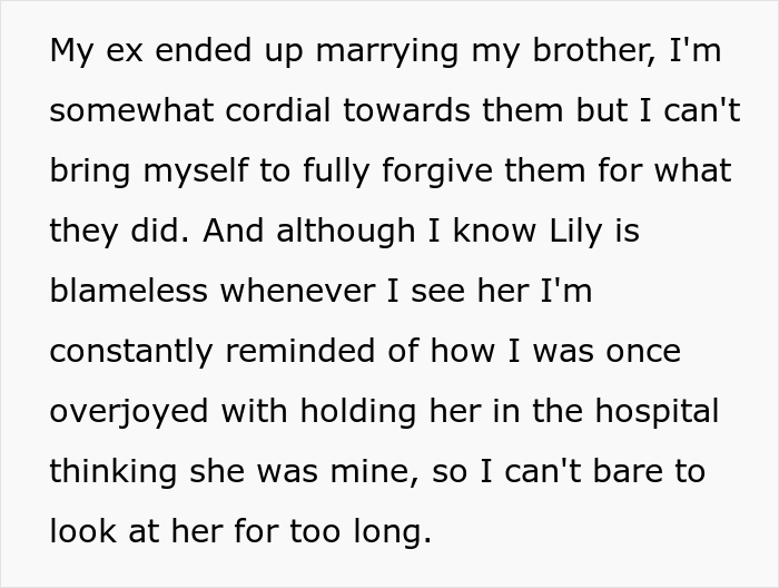 Load More Replies...I fully understand your complex feelings for and about Lily, and I don't blame you for having them. I do hope, however, that you can continue to remind yourself that Lily is also an innocent victim of your brother's and ex's perfidy. Maybe you don't need to pay for her college, but it'd be good karma for you to build a positive relationship with her, especially since she now feels betrayed by her parents.