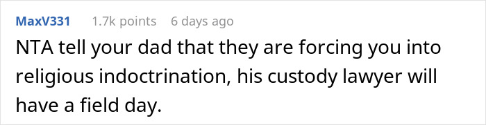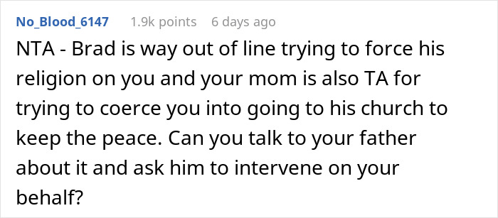 Load More Replies...Brad sounds like a misogynistic pain in the rear end. If you want to be religious, then be religious that is your choice, but you never force it on someone else. It's quite clear from my understanding of this situation that this is not a church, it is a cult. In church, you are allowed to ask questions without the Sunday school teacher kicking you out of the class. The mom seems like she is willing to sell her daughter down the river to keep Brad happy. Brad needs to figure out that not everyone believes the same things that he does and that is okay. I hope her dad is able to get her away from this environment. By the way, I myself am a Christian.