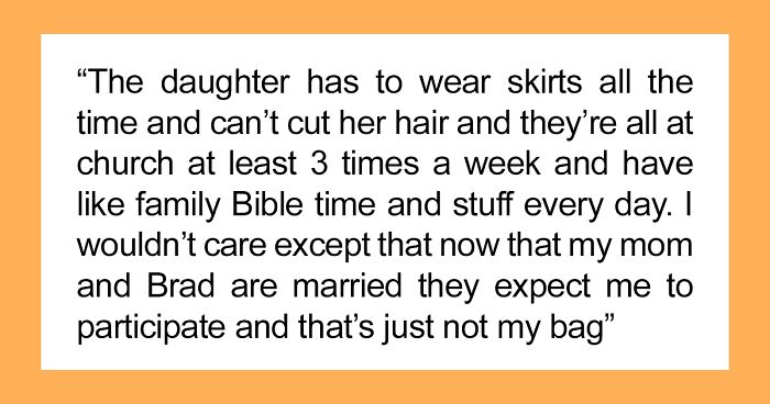 The Original Poster (OP) lives with her mom and stepdad Brad and his children who all go to Sunday school. The teen describes the family as very religious and has a lot of rules, such as girls having to wear skirts all the time and going to church several times a week.