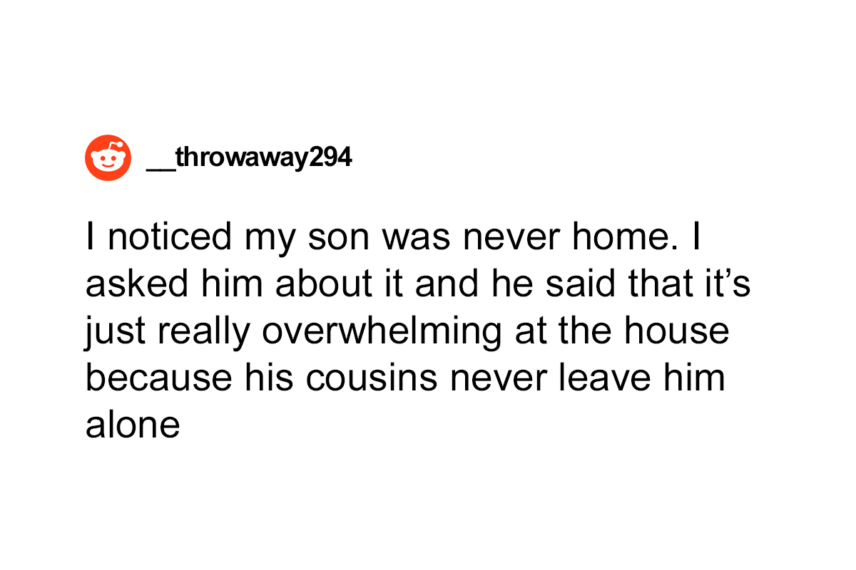 Load More Replies...Son sounds like he can recognise where his limits are and how to deal with them - as in cousins annoying him, so he takes himself off to where he is happy. That's something to be proud of in my mind, he's already aware of his own care regarding mental health. Mum needs to just ensure the line of communication stays open. And whether the son is in the right or wrong regarding watching his cousins, the Aunt still shouldn't start berating him personally, that's a d**k move