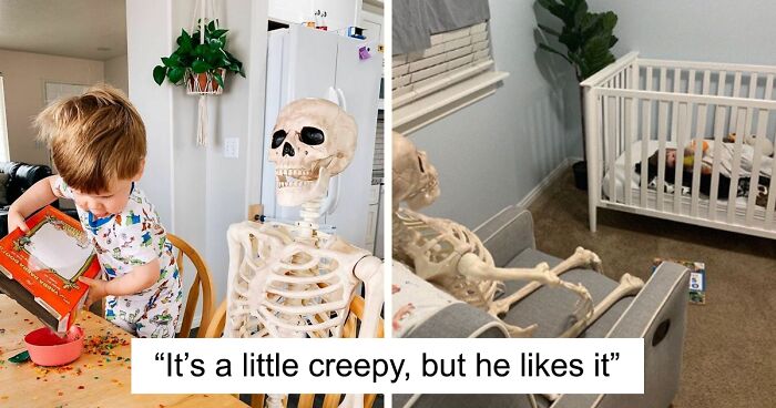 Toddler Befriends A Creepy Skeleton His Parents Got As A Halloween Decoration, Even Has It Watch Over Him As He Sleeps