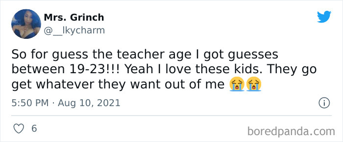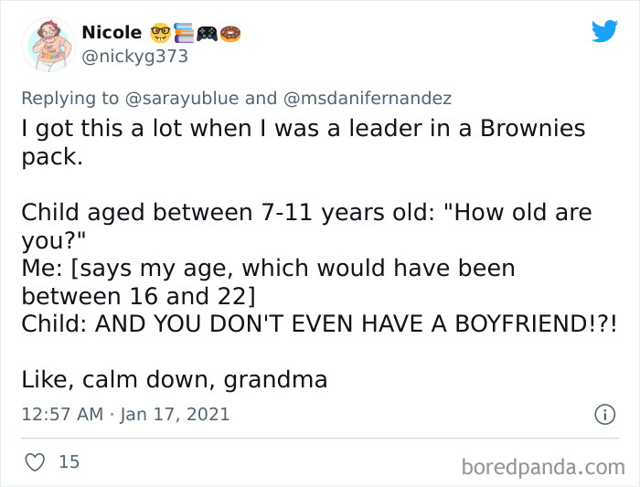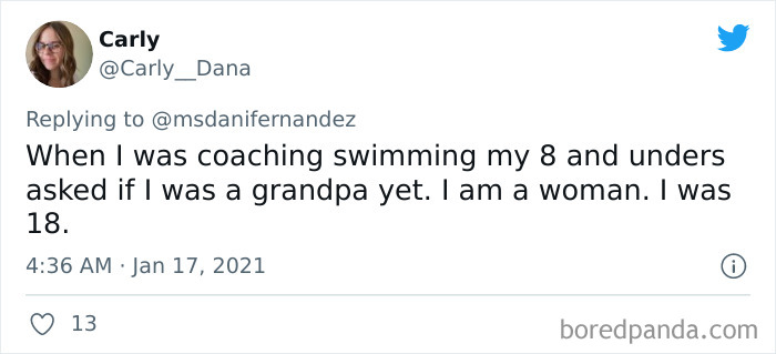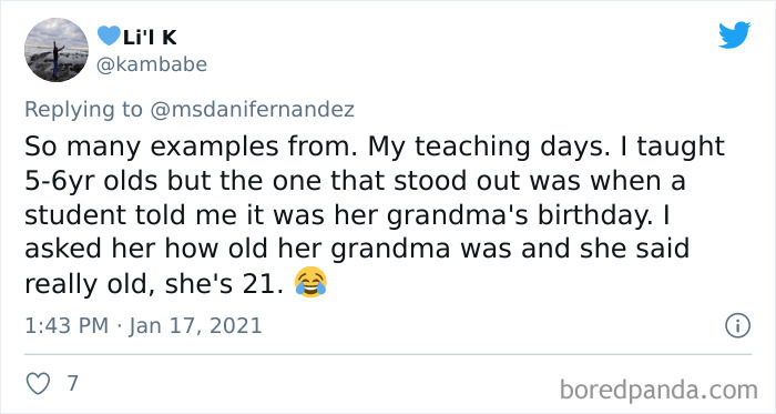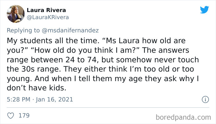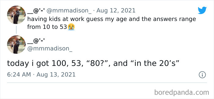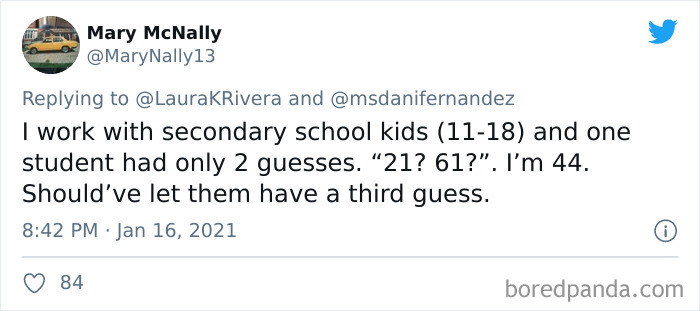 Load More Replies...When I was a young swim instructor (17-23) I would occasionally ask my students how old they though I was. The youngest kids guesses were hilarious. Sometimes they would seem to throw out random numbers, 9, 80, 42. Sometimes they would have some sort of logic like , you must be older than my brother and he is 8, so you must be at least 10. Or my grandma just had her 70th birthday, I don't think you're as old as her so you're probably about 60.