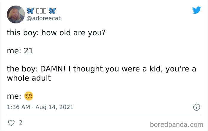 While these tweets mainly focus on kids making adults feel older than they are, some people do suffer from the opposite problem of living with so-called babyfaces. In their case, their looks just don't catch up to their age. Of course, this is subjective–they won't be asked for I.D. in every bar. These people are in the company of celebrities like Leonardo DiCaprio, with several childlike facial features, such as short nose and plump cheeks. Those features are called neotenous. Scientists are investigating the relationships between neoteny and perceived attraction in different sexes.