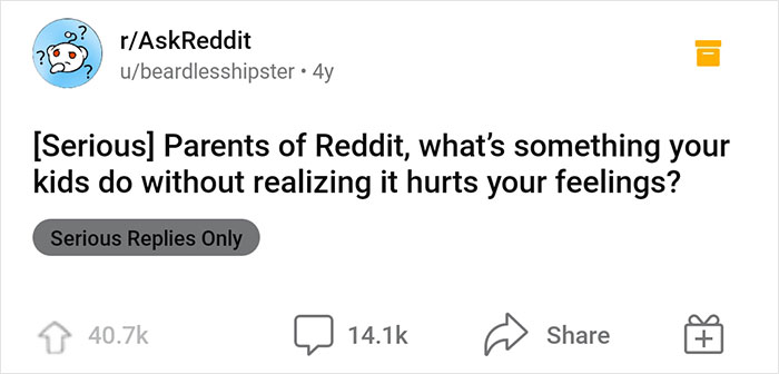 Here’s the thing, though, children can be unintentionally savage with their comments. Redditor u/beardlesshipster sparked an online discussion when they asked people what their kids have done that hurt their feelings without them realizing it. You’ll find the most interesting stories—both serious and slightly silly—as you scroll down.