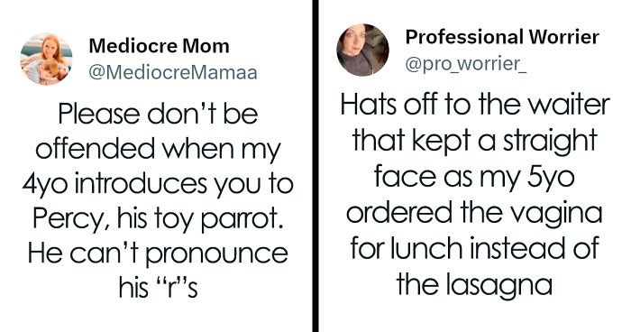 Load More Replies...My son was good for mispronouncing or redefining words. Chameleons had "cameraflage" (meaning you couldn't take pictures of them, I guess). A cookout was a "steakout" because you cooked steaks on the grill. His uncle, who he disliked he said had OCAD which he explained was Obsessive, compulsive a*****e disorder. My niece used to call omelettes "omelopes" and macaroni "mickeyronis". My grandson pointed to a church and told his mother that "cheezitz" lived there. But the top prize belongs to his mother, my stepdaughter, who called getting a splinter under her skin as "having a "woody".