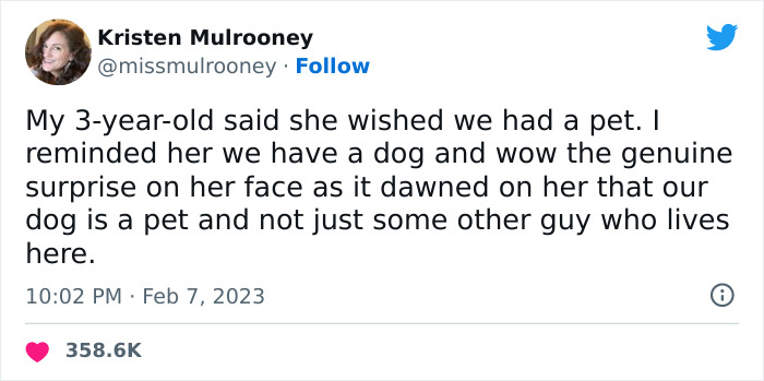 Kristen Mulrooney recently tweeted about her 3-year-old’s revelation that their dog is actually a pet, and many other parents were inspired to share similar conversations they’ve had with their own little ones. So below, you'll find some of the most hilarious times kids adorably mistook their pets for humans, as well as interviews with Kristen and bioethicist and writer Jessica Pierce, Ph.D. Enjoy scrolling through this list (where, let’s be honest, these children make some very valid points!), and be sure to upvote all of the pics that warm your little pet-loving heart. Image credits: missmulrooney