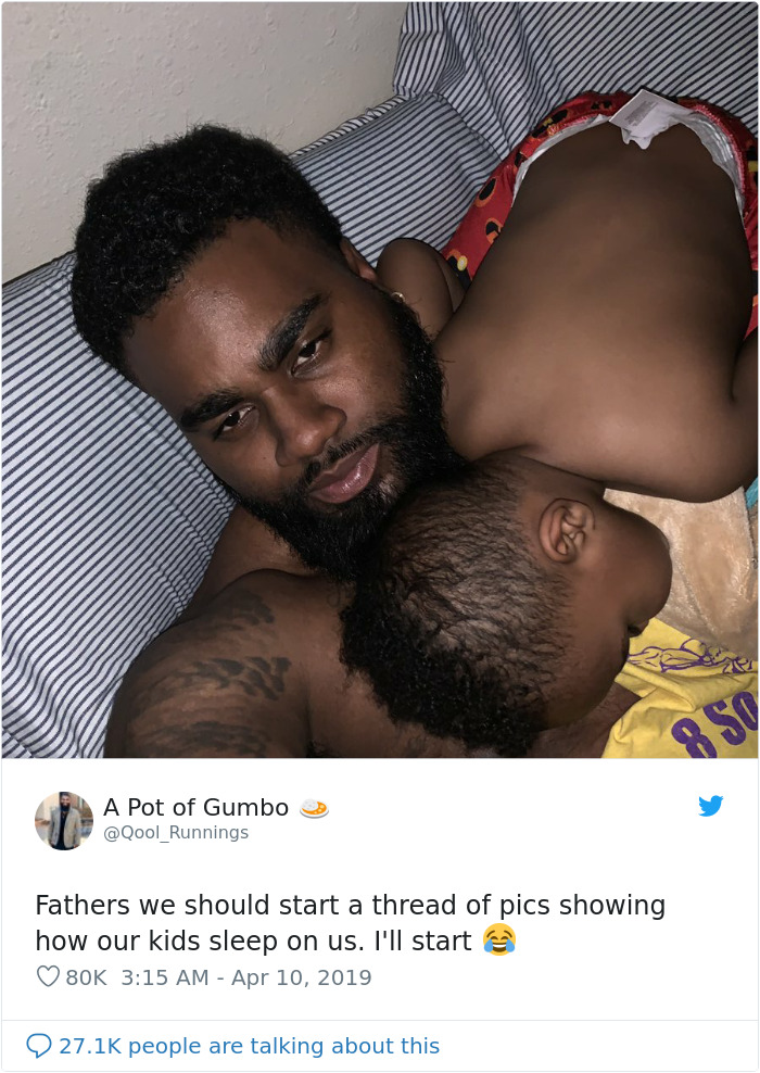“Fathers, we should start a thread of pics showing how our kids sleep on us,” he wrote, and it clearly resonated with people! Dads from all over the world joined in with their own pics, as well as exchanging opinions and tips on fatherhood in general.