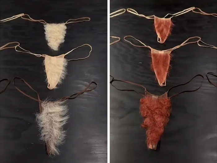 Coming in colors such as “Sienna Blonde,” “Clay Black,” and “Cocoa Ginger,” the underwear is described on the official website as “hand-made in a super sheer, stretch mesh featuring a mix of curly and straight faux hair.”