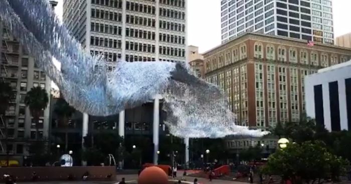 Patrick Shearn of Poetic Kinetics put together 15,000 square feet of silver streamers and hung it up above Pershing Square in Los Angeles. This kinetic sculpture is called ‘Liquid Shard’ and it’s elegant movements mesmerizes anyone who takes the time to admire it.