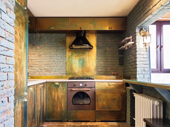 A copper hammered sheet behind the stovetop creates a contrast and a focal point. You can leave it polished for a shiny appearance or allow it to develop a natural patina over time. If you’re not ready for a full commitment though, try a subtle touch with copper accents or trims along the edges of your backsplash. This can be a great way to incorporate copper without overwhelming the space.