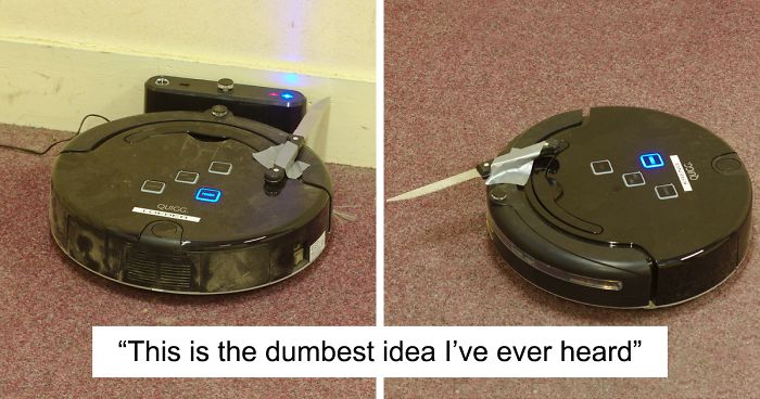 We here at Bored Panda are very safety conscious. So we believe that taping a knife onto your Roomba is a bad idea. (Unless you have to fight off evil alien monsters, that is.) However, maintaining your Roomba, if you have one, is something that all owners should do. After all, your tiny robot-helper can clean everything. Just not itself.