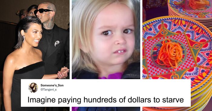 Well, half the internet took it upon themselves to find creative ways to roast this very gourmet Italian meal to no end with comments ranging from folks wondering if it’s possible to pay hundreds of dollars “to starve” to asking the question “can pasta can be a singular noun” to “at least the plates are pretty.”