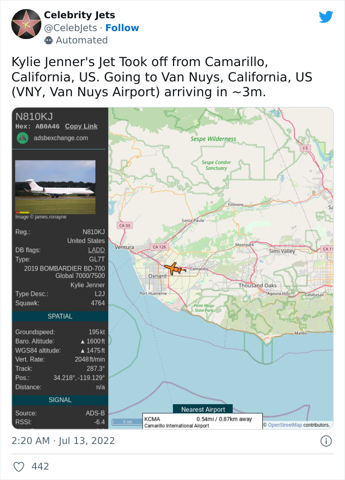 So, Celebrity Jets, an automated Twitter account that reports private flights by celebrities, reported on July 13th that Kylie Jenner’s private jet took off from Camarillo Airport in California and reportedly flew 3 minutes to Van Nuys Airport.