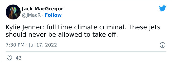 OK, so let’s break it down. For the most part, much of the reaction amounted to calling Kylie a “Full-Time Climate Criminal” for flying private. Why? According to Transport and Environment, private jets can be anywhere from 5 to 14 times more polluting than commercial planes and 50 times more polluting than trains. And while technically cars aren’t as CO2-effective as planes due to the gas to passenger per distance ratio, even that would have been much less polluting than a private jet given the distance.