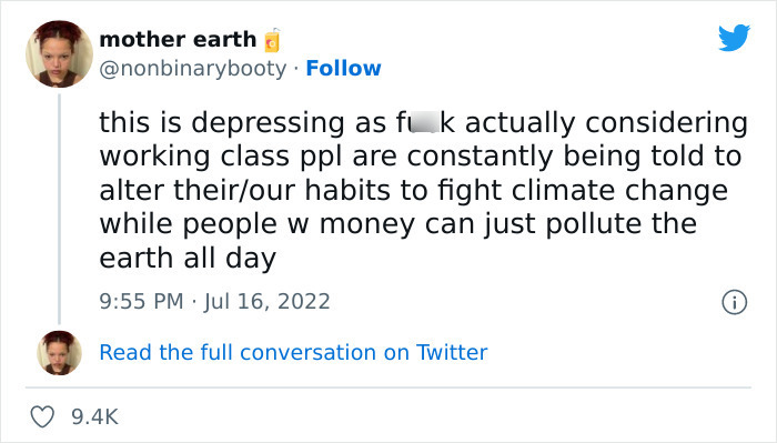 This is exactly what I posted on another page. The hypocrisy of asking people with little resources to make all the efforts when in reality it makes no difference in the face of what these super-rich and big companies are doing is driving us straight into the wall. And I'll make myself the devil's advocate here, but if millions of people are willing to fuel her lifestyle by worshiping her, then why shoud she not ? The problem goes both ways.