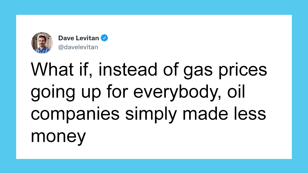 That would mean the value of oil would have to drop and companies would raise their prices to compensate. And investors would reduce investing in oil. I don't think we're pointing the blame at the right people. It's more than just oil prices. Every resource is increasing. Lumber, paper, meat, metals, water, energy, gas, transportation, produce, you name it. Somewhere down the line someone is living in luxury without a care and laughing at us minions.