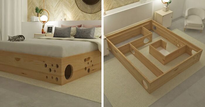 This bed looks normal at first. However, it has a secret underneath: a labyrinth designed as a safe play or sleep area for the furry creatures. On their Instagram, they say: “With our bed, our cat clients don’t feel invaded in their territory, nor do they have to run looking for a safe space to hide. Under this bed, they find a quiet place, full of calm and security, and best of all, it still has the same functionality for the owner! You will continue to rest as you normally would, but now, you provide a unique den to your cat.”
