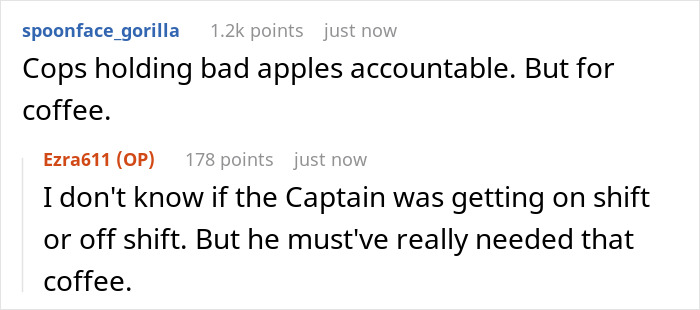 The restaurant’s doors opened, and the first set of patrons entered. Surprise, surprise, it was a group of local police officers, alongside their captain and the culprit who had blocked the author’s driveway earlier. The captain made his way to the counter to order a coffee – however, he was told that there was a 5-minute wait due to the server’s late arrival. To keep the conversation going, the man pondered the reason behind the creator’s tardiness and was immediately shown the pic of his subordinate, who the creator then explained had blocked his driveway for 45 minutes for a routine traffic stop.